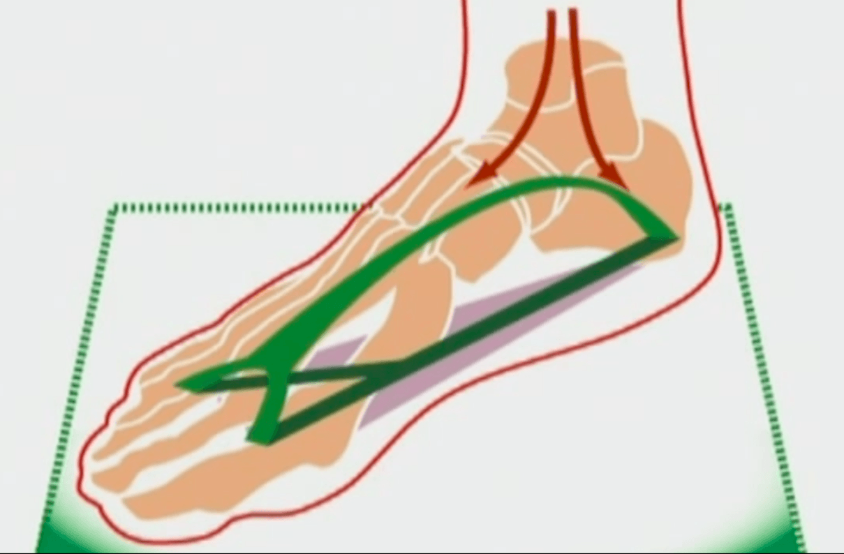 Bij elke stap die we zetten komt drie tot vier keer ons lichaamsgewicht terecht op die voet. Daar is de voet op ingericht. De middenvoetsbeentjes zijn superbeweeglijk en onder de voet loopt een grote stevige, maar buigzame dikke peesplaat. Die peesplaat vangt de klappen op. Dat is de enige echte schokdemper van je hele lijf..